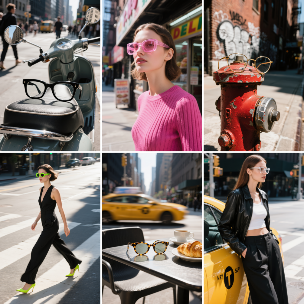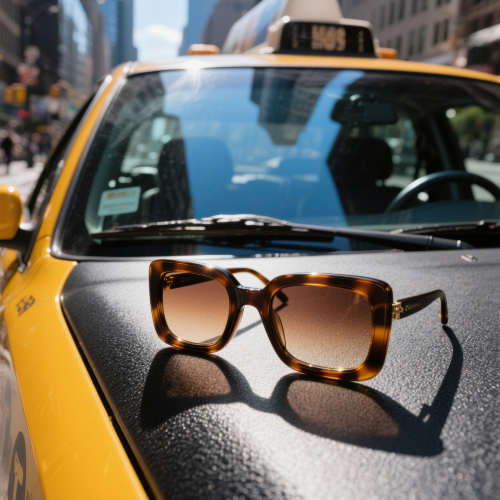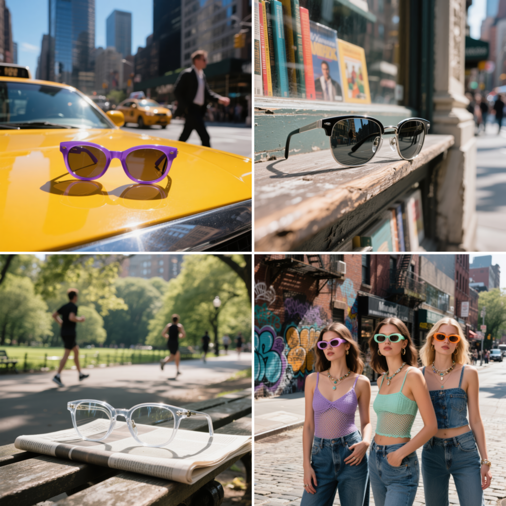 – Sunglasses shot in situ: on taxis, café tables, bookshelves, and park benches.