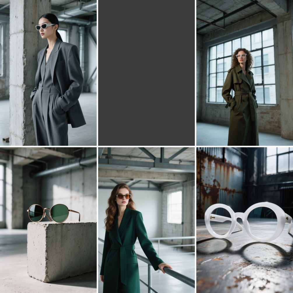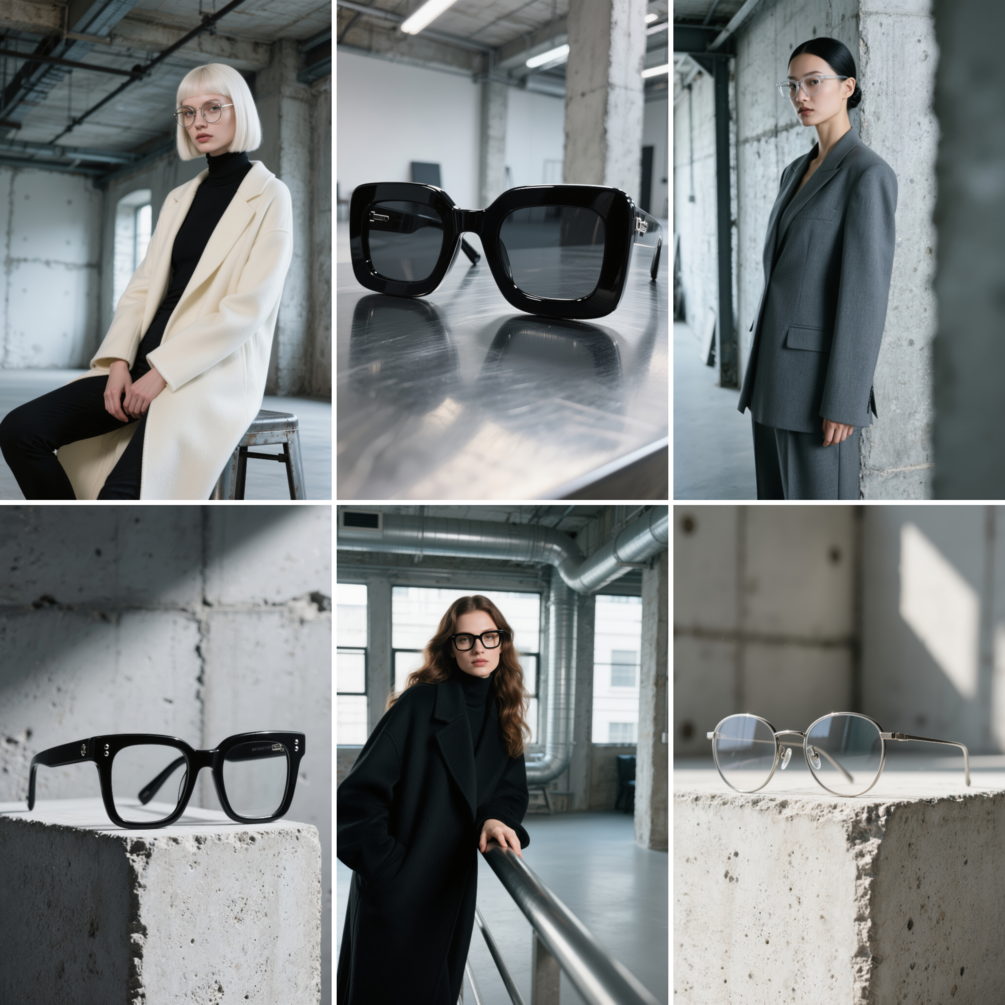 – Eyewear showcased against concrete, metal, and minimal backdrops.